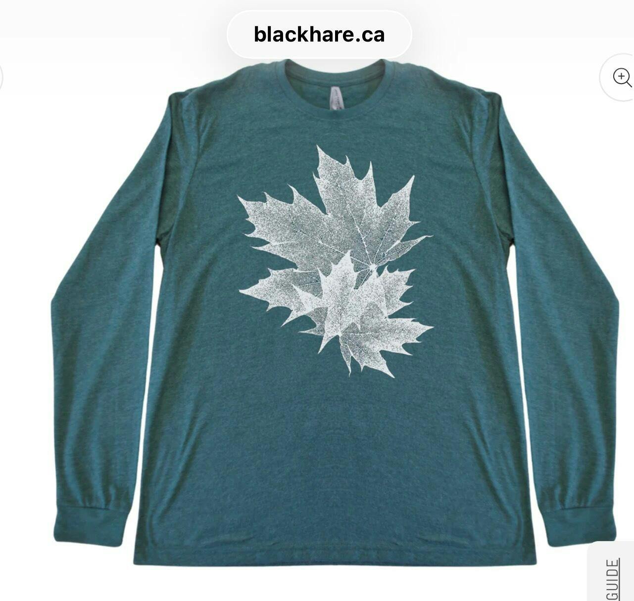 J'ai d'abord utilisé ces images d'érable sur mon art du verre , et je les ai tellement aimées que lorsque nous avons commencé à imprimer des t-shirts graphiques, nous avons décidé de les mettre également sur des chemises.