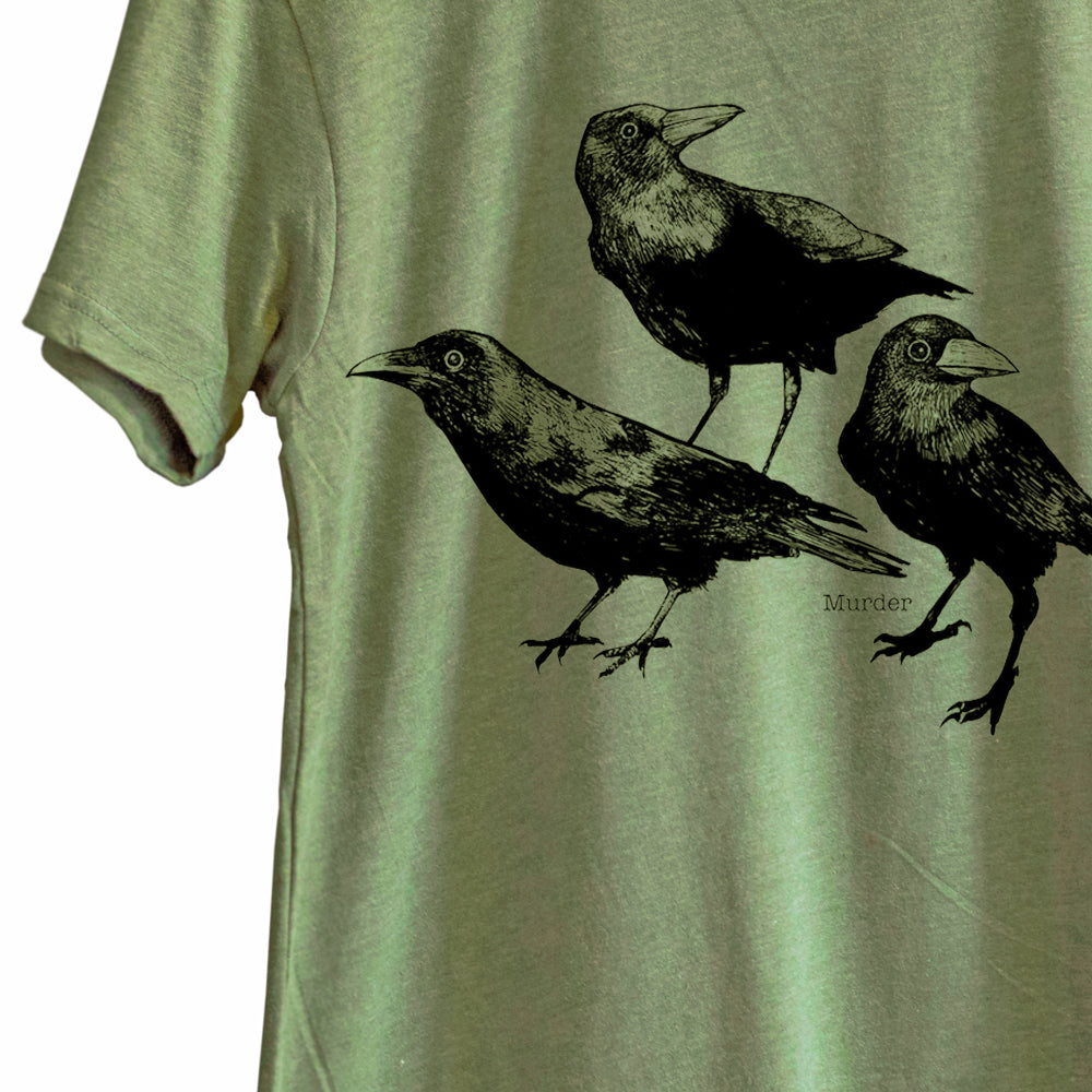 Ce design est notre premier essai d'une série « groupe d'animaux aux noms étranges ». Nous avons d'abord choisi « Meurtre de corbeaux » , inspirés par les corbeaux omniprésents à Sackville, au Nouveau-Brunswick, où nous vivions autrefois. Nous avions un groupe de corbeaux qui organisaient de grandes fêtes dans l'arbre de notre jardin et se rassemblaient là tous les jours. Nous ne savions jamais vraiment ce qu'ils faisaient, mais ils avaient certainement un plan ! Ce t-shirt est notre hommage à ces oiseaux incroyablement intelligents, quelque peu effrayants et impressionnants.