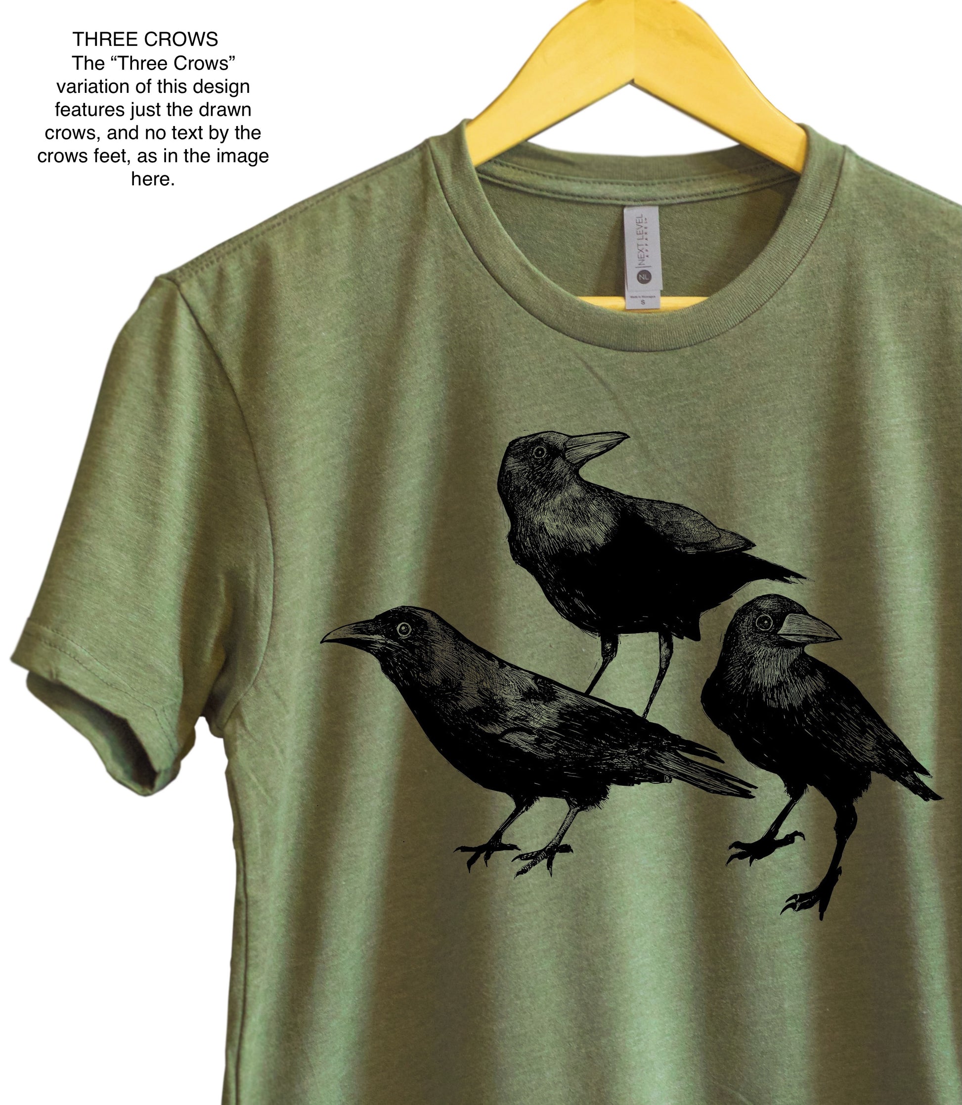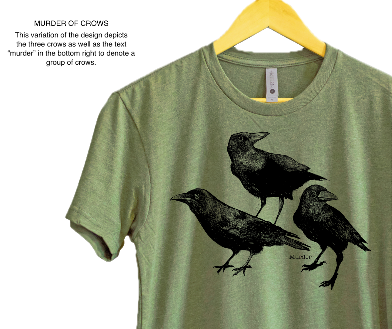 *Si le design vous plaît, mais que vous ne souhaitez pas le texte « meurtre », optez pour notre variante « Trois Corbeaux » . Cette option ne comprend que les oiseaux, sans texte.