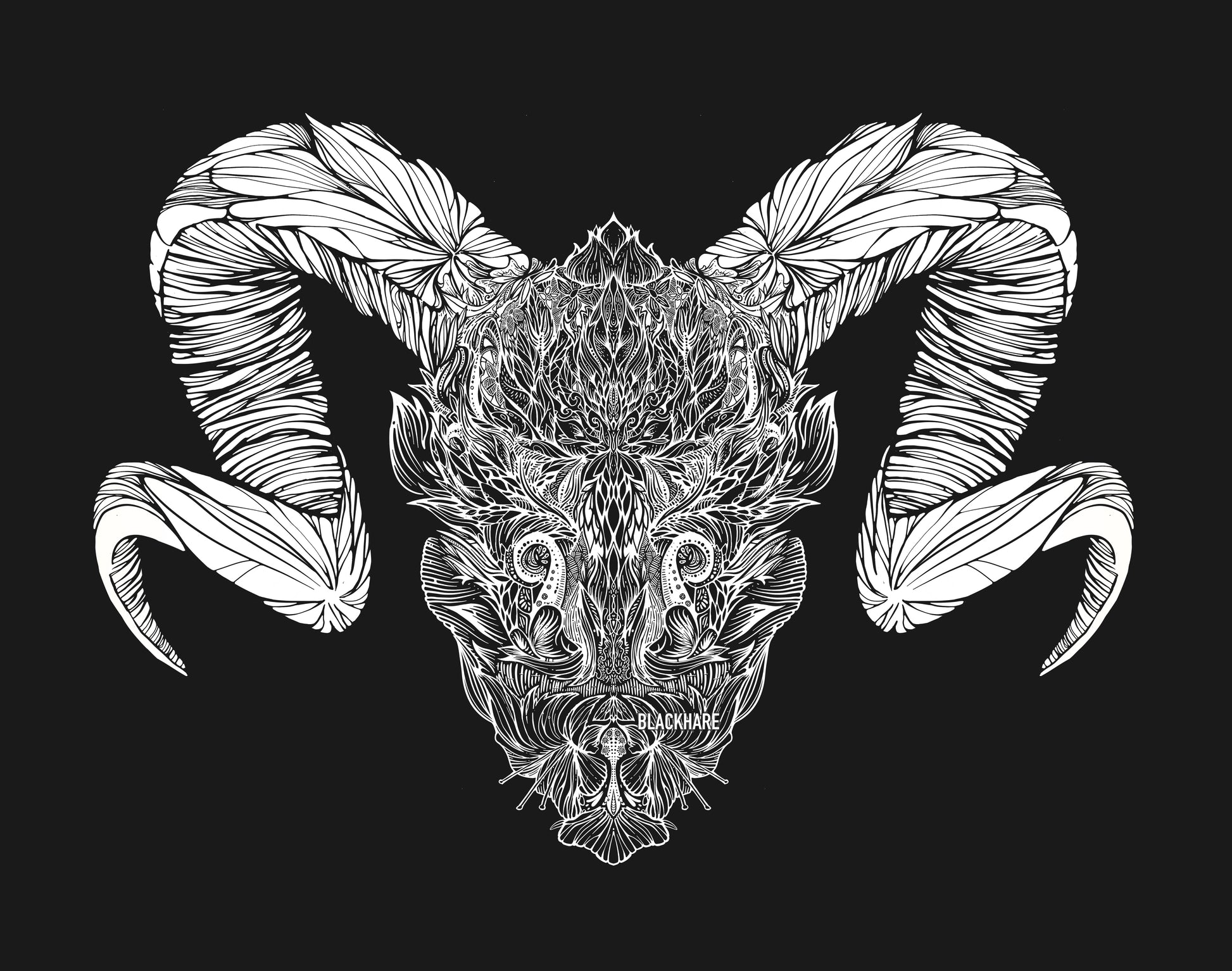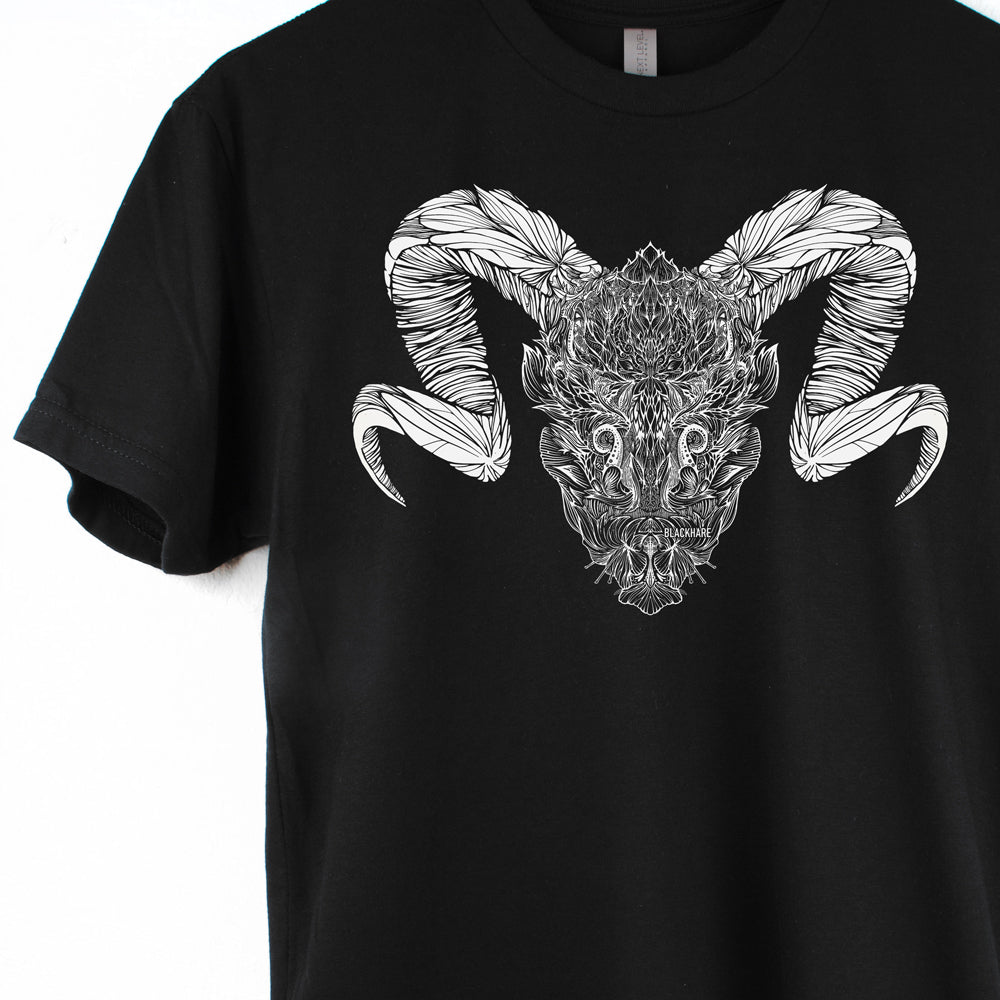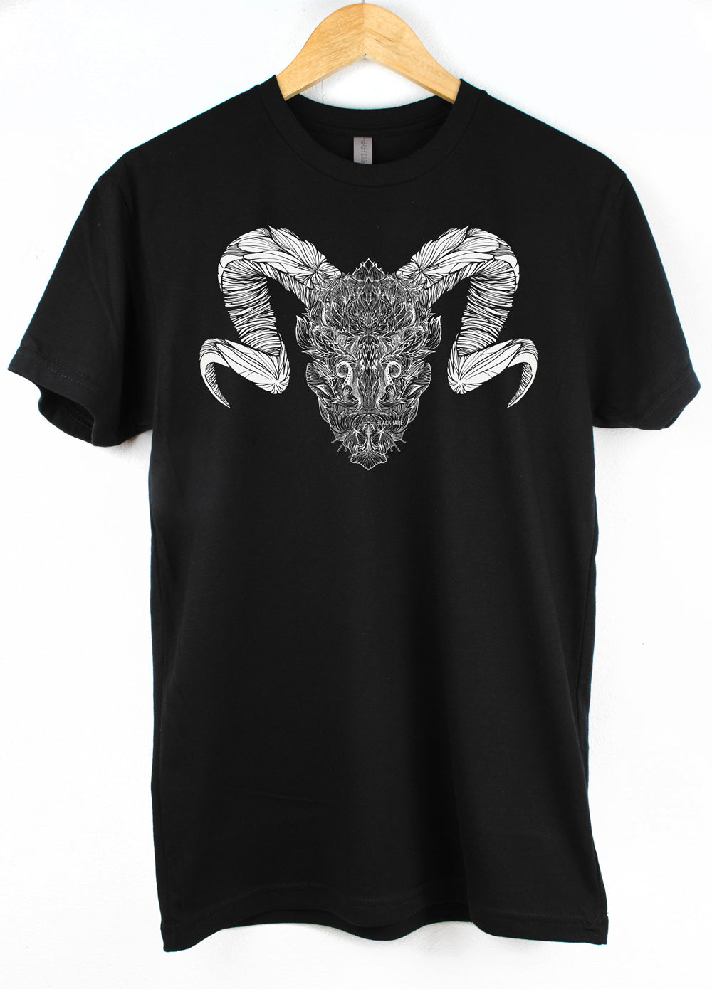 Le Crâne de Bélier est un ancien motif que nous avons remis en circulation. Son dessin complexe est caractéristique de mon style de dessin de l'époque où je travaillais beaucoup au crayon et au papier. C'est une de ces illustrations qui, au départ, n'était qu'un gribouillage, mais qui est devenue un motif qui, selon moi, rendait bien sur un t-shirt. Comme notre motif Guitar Bear, celui-ci a connu plusieurs itérations sur nos t-shirts. Je pense néanmoins que j'en suis satisfait !