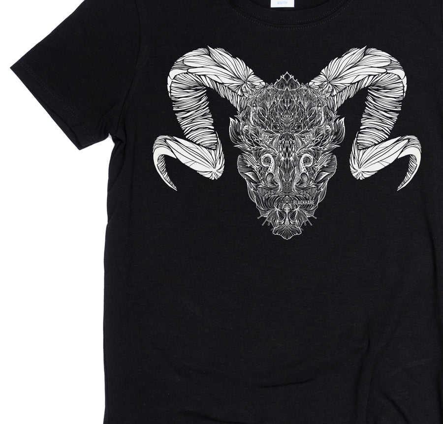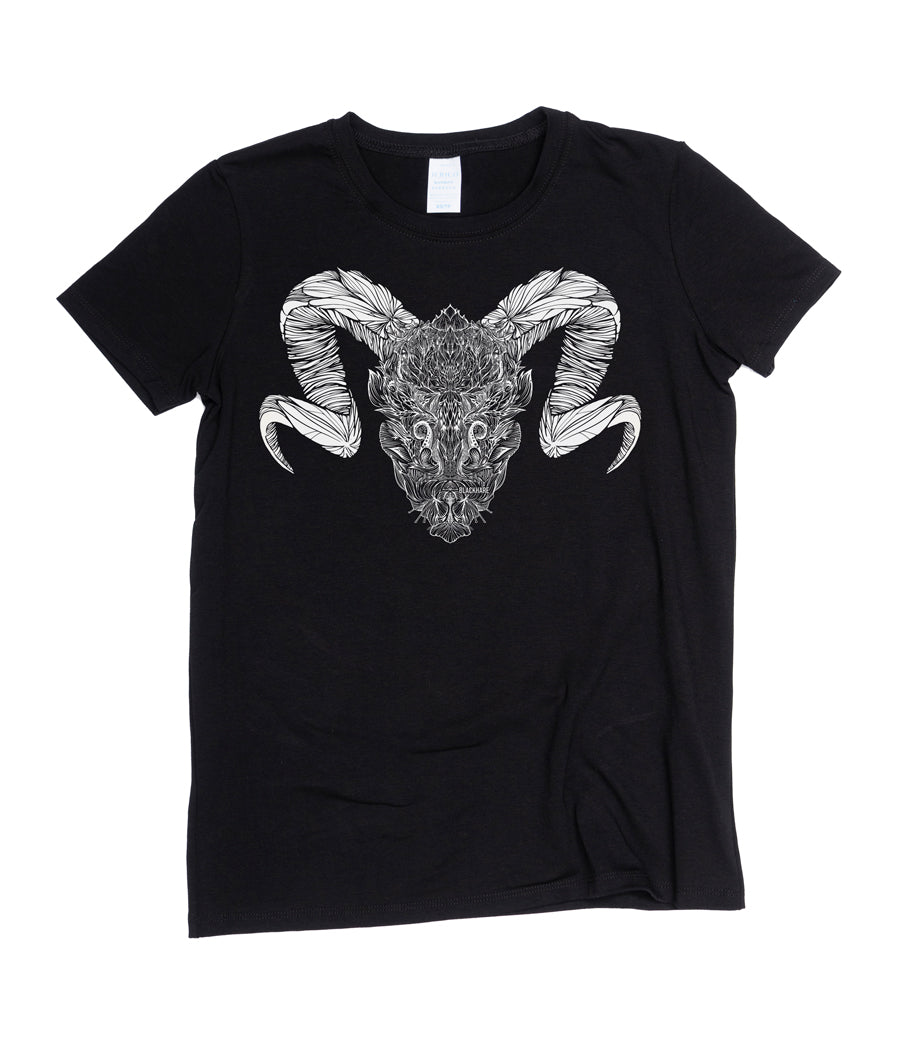 Le Crâne de Bélier est un ancien motif que nous avons remis en circulation. Son dessin complexe est caractéristique de mon style de dessin de l'époque où je travaillais beaucoup au crayon et au papier. C'est une de ces illustrations qui, au départ, n'était qu'un gribouillage, mais qui est devenue un motif qui, selon moi, rendait bien sur un t-shirt. Comme notre motif Guitar Bear, celui-ci a connu plusieurs itérations sur nos t-shirts. Je pense néanmoins que j'en suis satisfait !