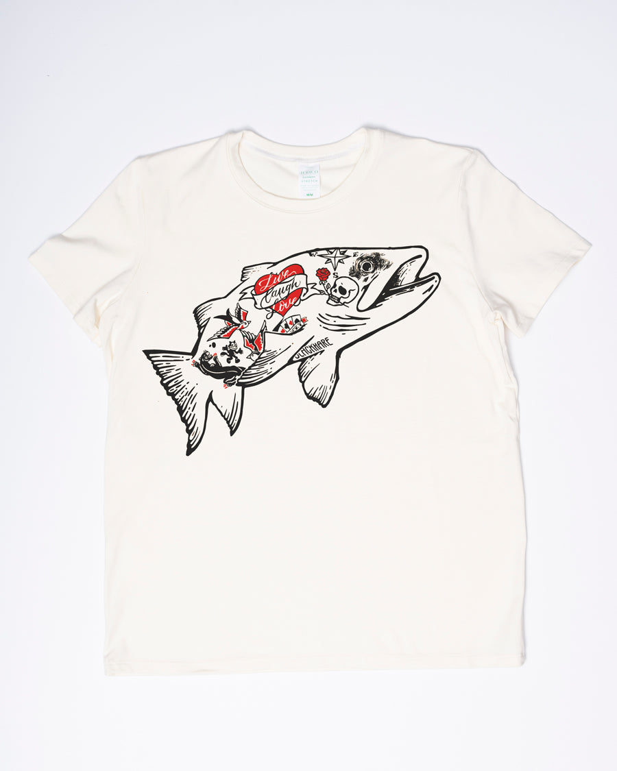 J'ai toujours été inspiré par les tatoueurs aux dessins impeccables et soignés. PlutÎt que de les imiter, j'ai décidé de leur laisser le soin de réaliser ce travail génial et de m'amuser avec ces motifs symboliques sur cette truite tatouée.