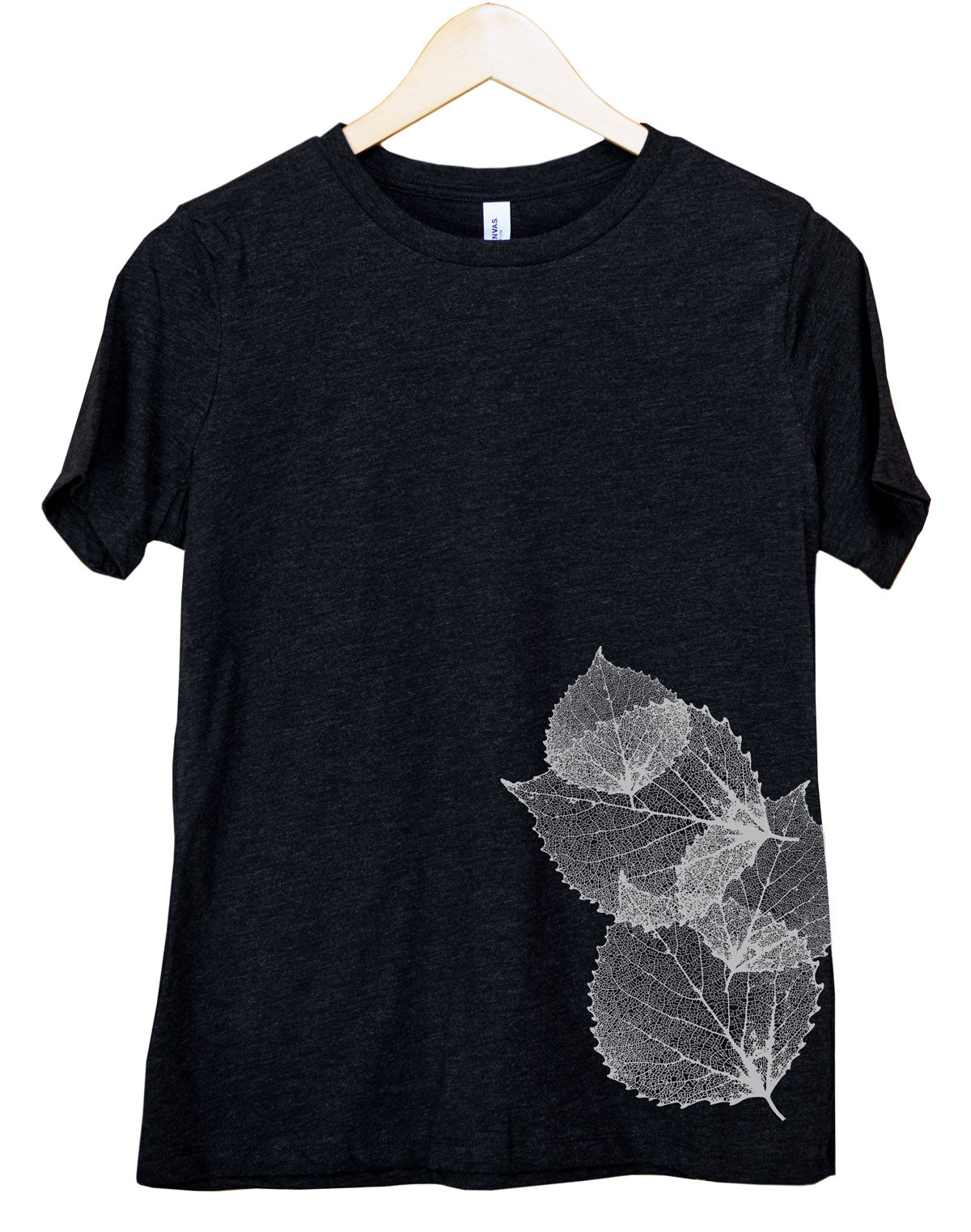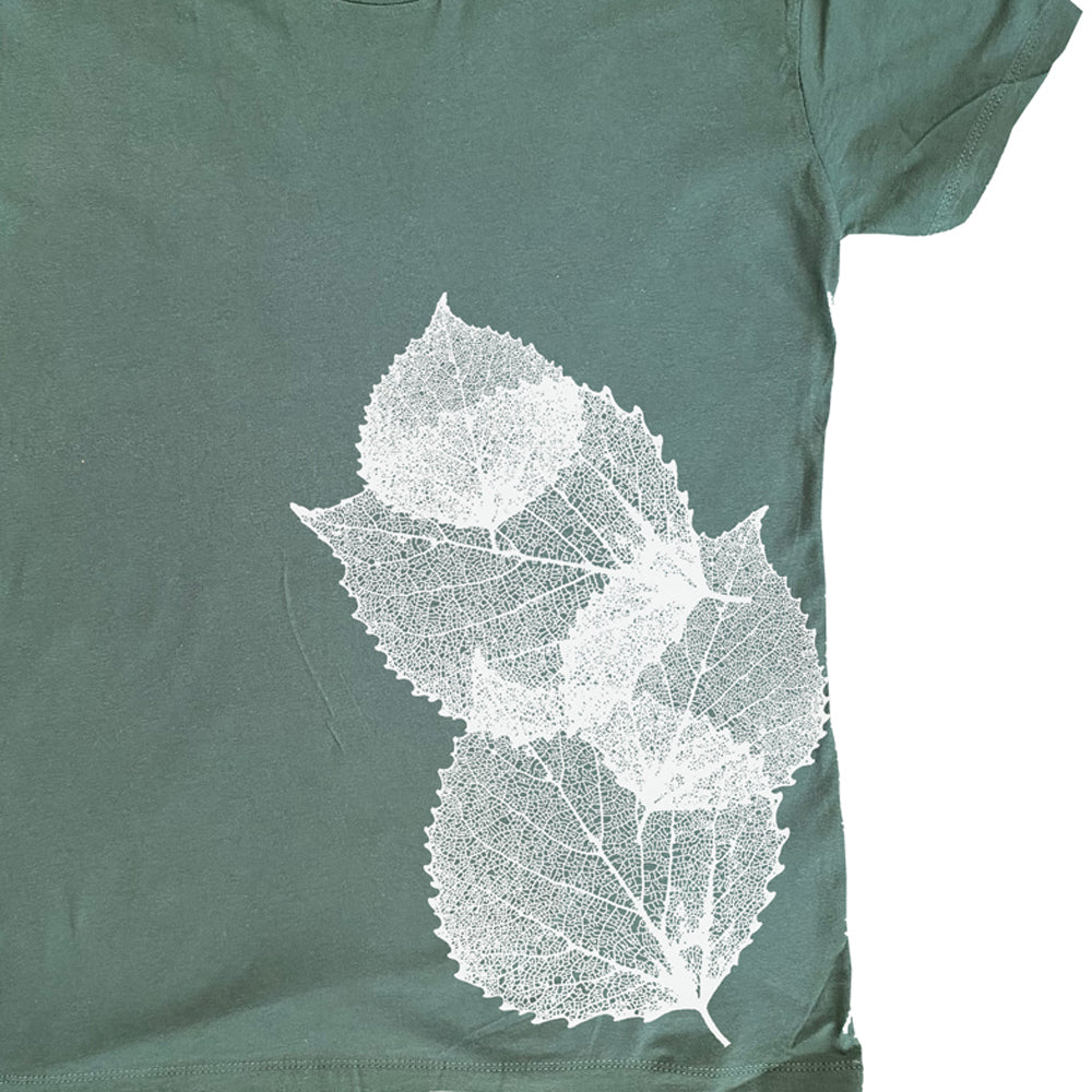 All of Flora designs, including this one, start with macro photos of different types of leaves that capture their delicate lines and veins. Then these images are digitally edited to enhance the contrast and create transparencies, which are exposed onto the silkscreens. Next, they're handprinted onto the shirt fabric for a crisp and super elegant print. Read more about the creative process behind these tees.
