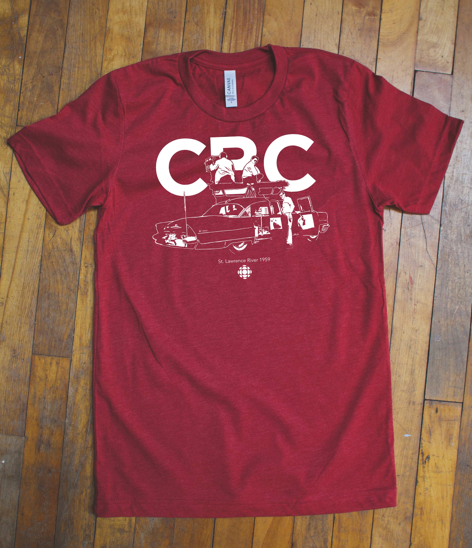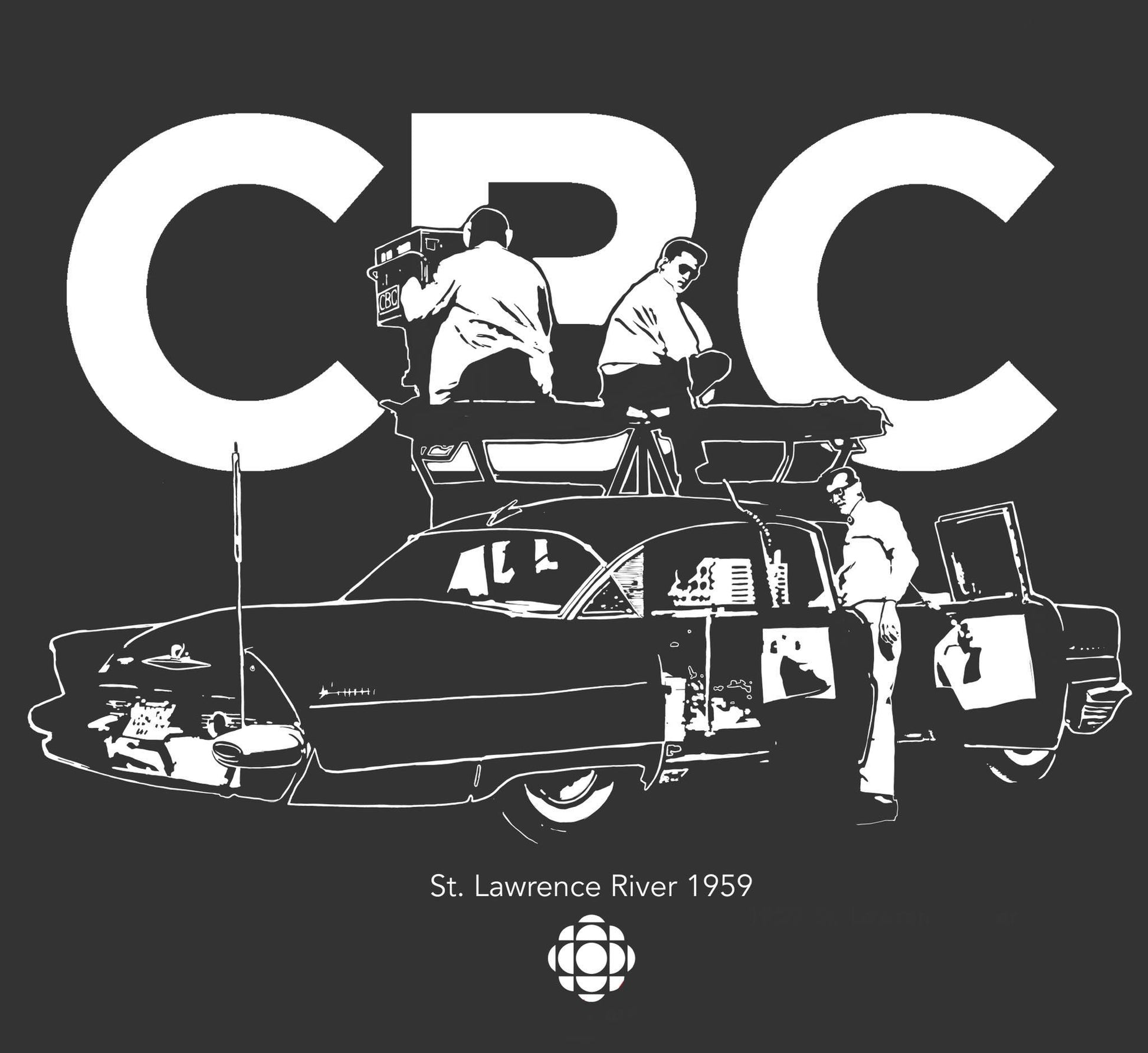 This tee shows a mobile reporting crew with their gear preparing for the official opening of the Saint Lawrence Seaway between Montréal and Lake Ontario in 1959. The Seaway was recognized as an incredible feat in engineering, allowing massive industrial cargo ships to traverse the waters for the first time. It was a huge public event, presided over by Queen Elizabeth II herself, as well as as the US President Dwight D. Eisenhower.