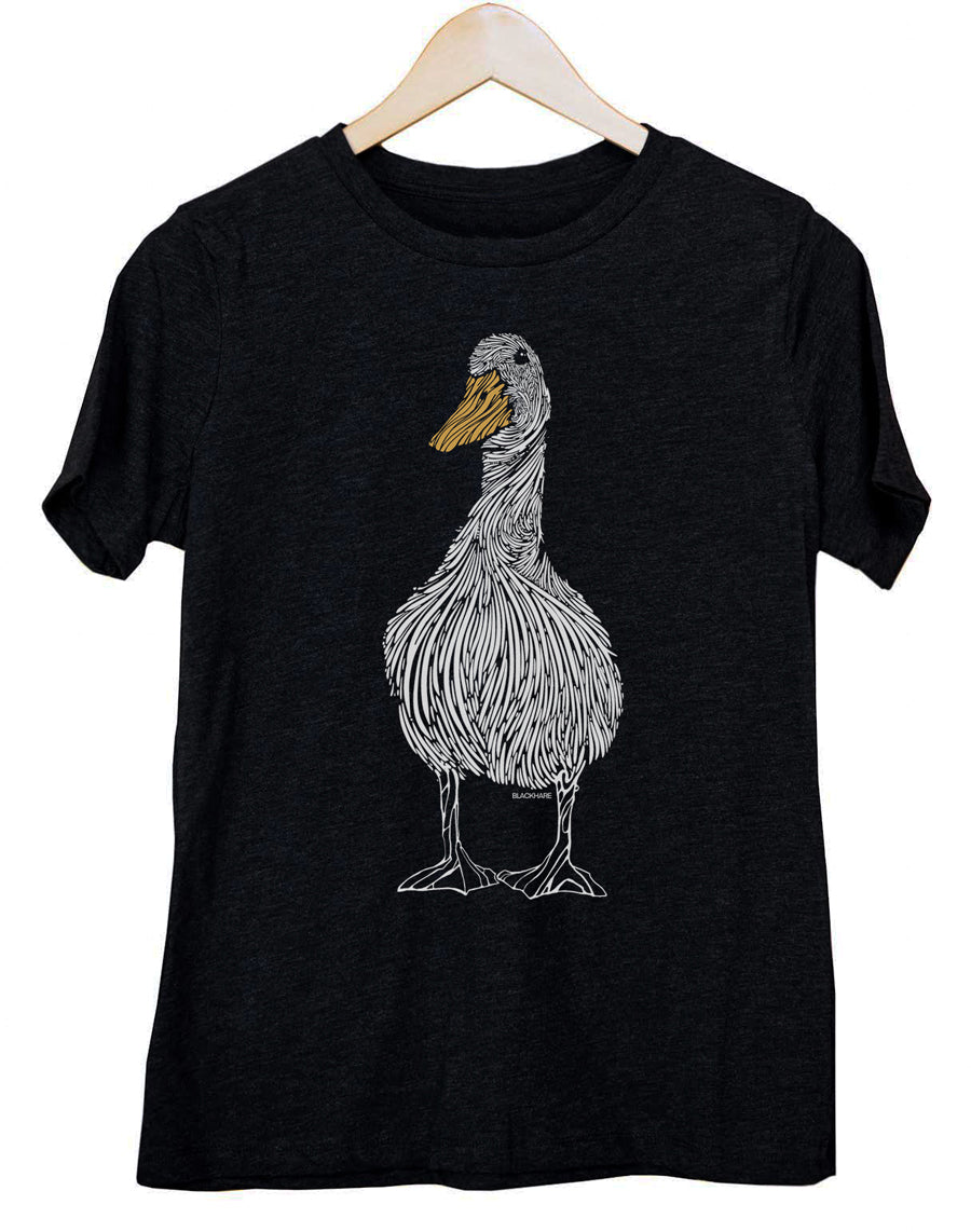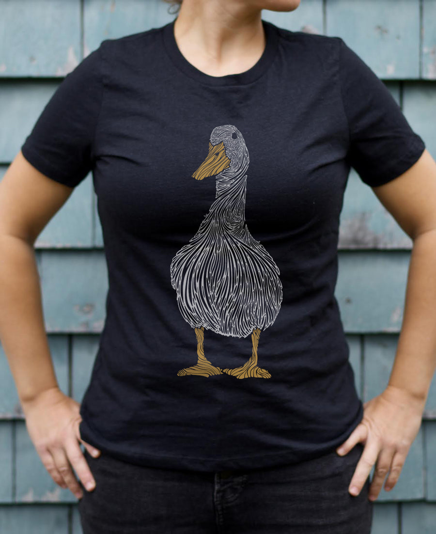 The Duck is another design that's all about playing with line and texture. It's oversized on a women's tee with well-defined lines and a pop of yellow.