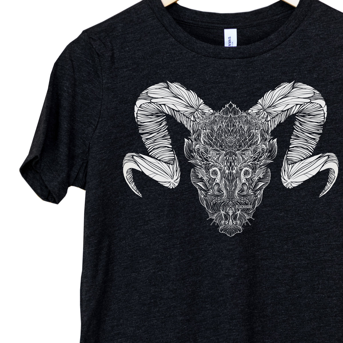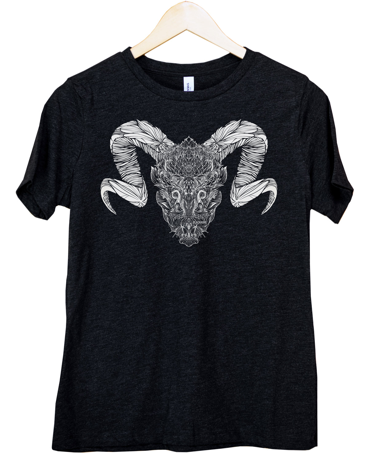 The Ram's Skull is an older design that we've brought back into circulation. The intricate line work is characteristic of my drawing style back when I did a lot of pencil and paper work. This is one of those illustrations that started out as a doodle but turned into a graphic that I thought we look good on a tee. Like our Guitar Bear design, this one has been through a couple iterations on our tees. I think I'm happy with this one though!