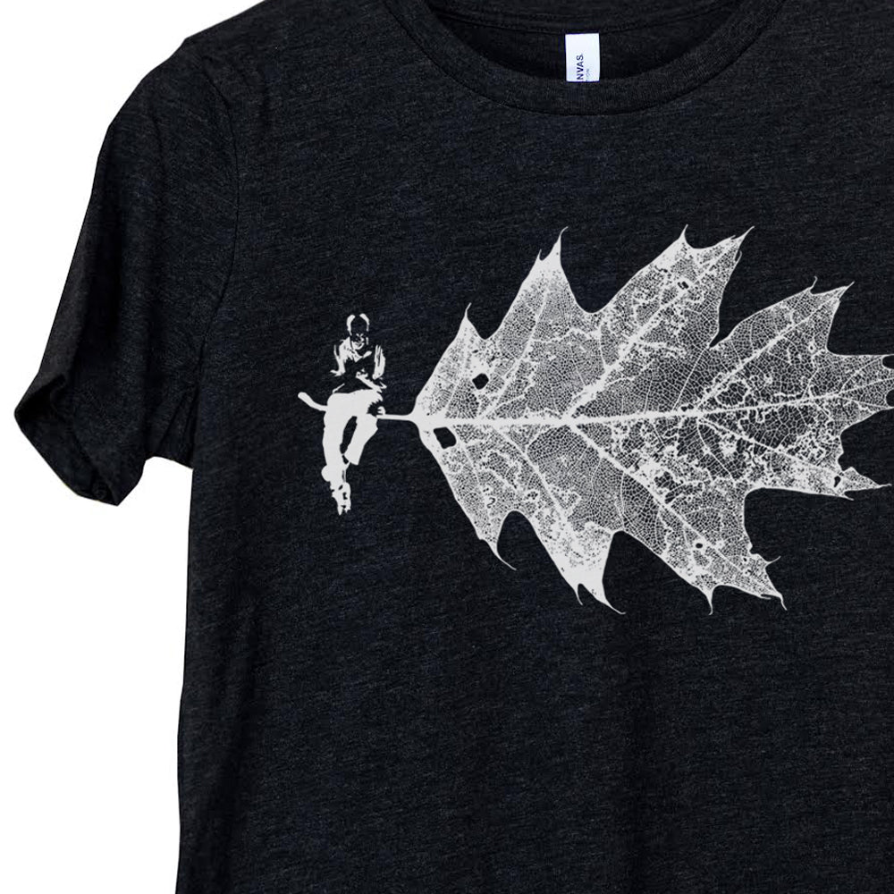 Like our Cascading Leaves and Maple Leaf designs, this image is based on one of my original photographs. All or flora or "leaves" designs start as macro photos of different types of leaves that capture their delicate lines and veins. Then these images are digitally edited to enhance the contrast and create transparencies, which are exposed onto the silkscreens. Next, they're handprinted onto the shirt fabric. In the case of "The Reader" design, things took a bit of a whimsical turn as I played around with superimposing the reading man, taken from another original photograph, into the leaf image.
