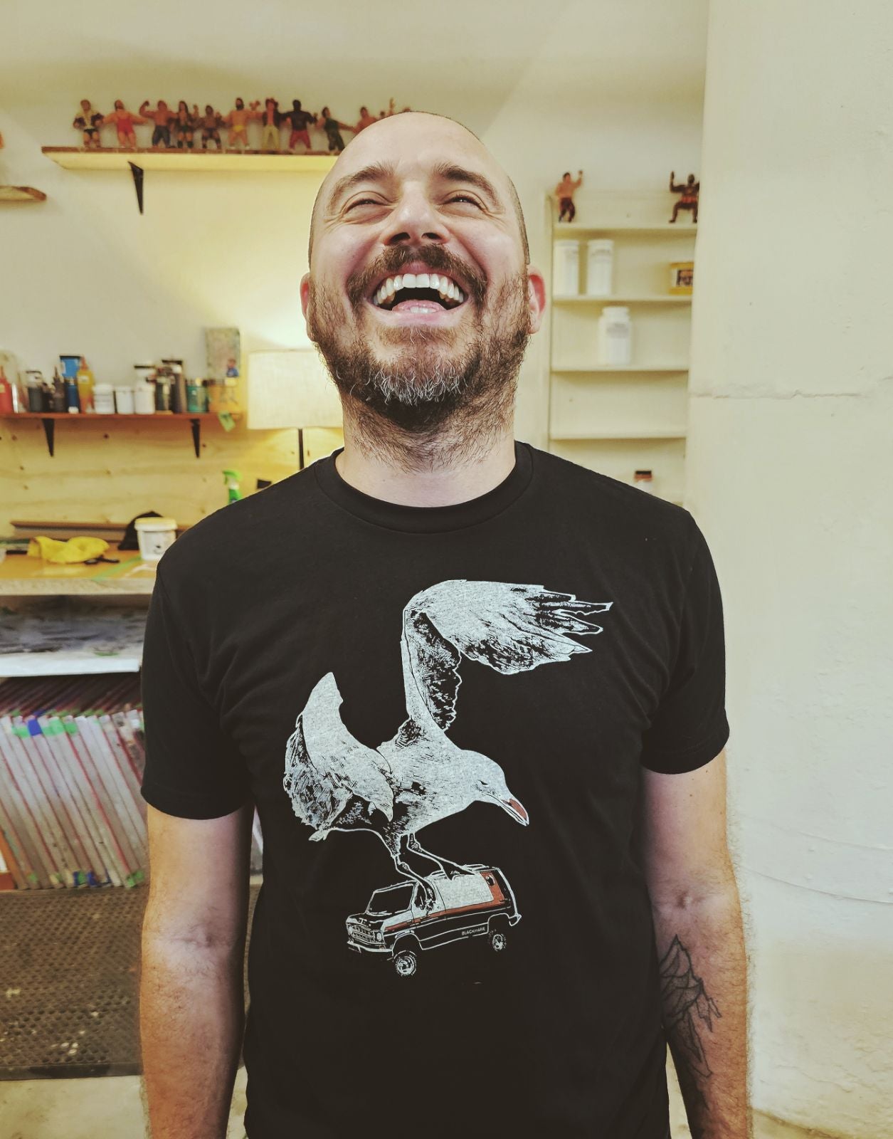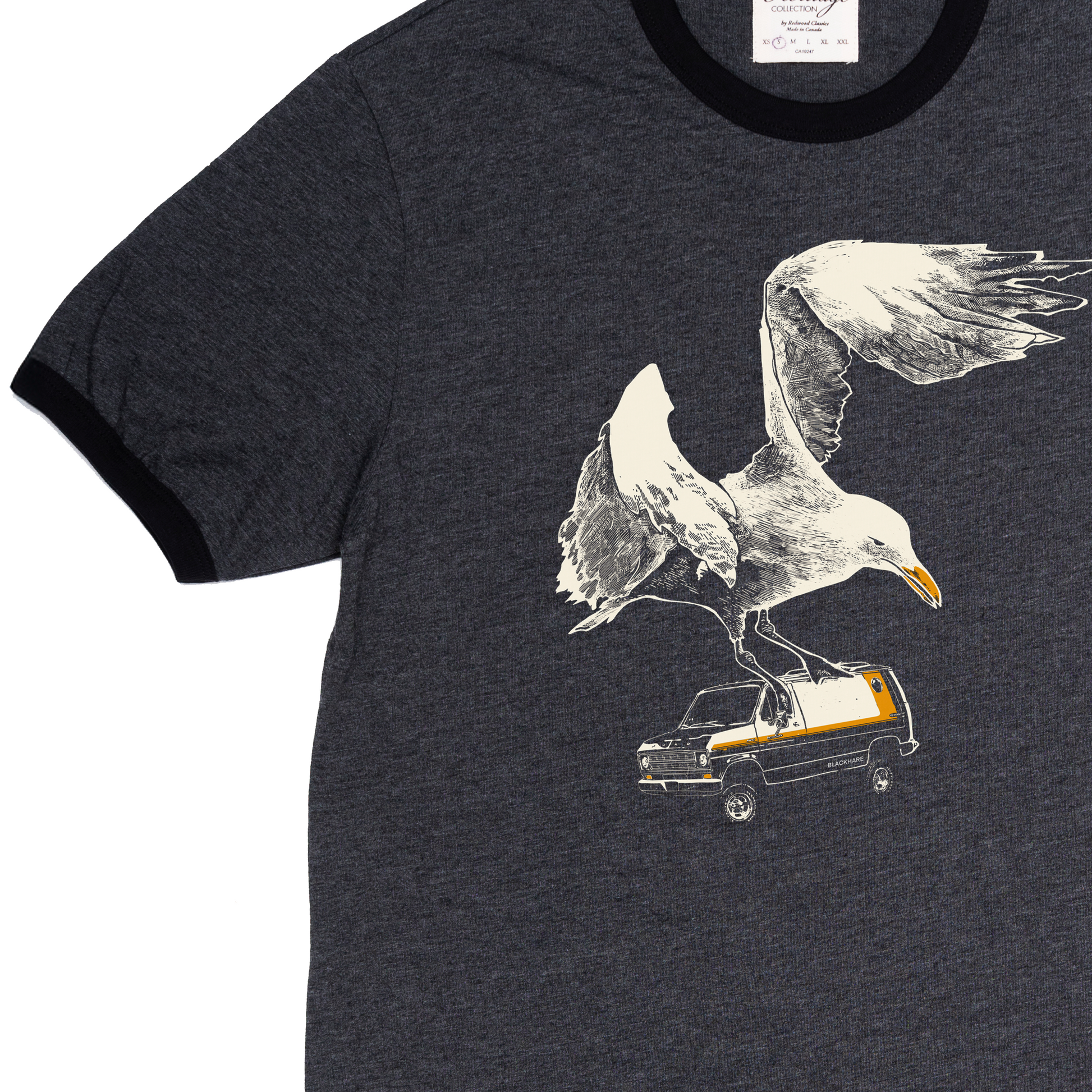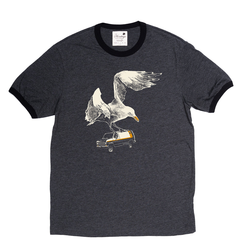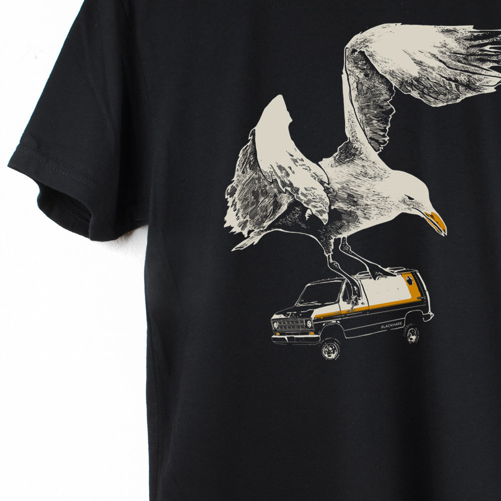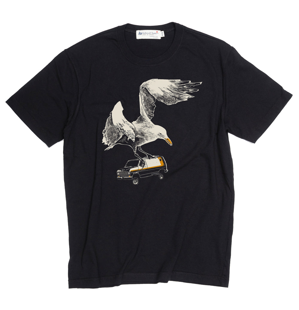 This image is a meeting of two things Nick loves to draw - birds and vintage cars/vans. In many of his photographic designs, there's an element of surrealism in the play with scale, detail and composition. If you're into the whimsy, check out the Reader or Marsh Mushrooms tees.